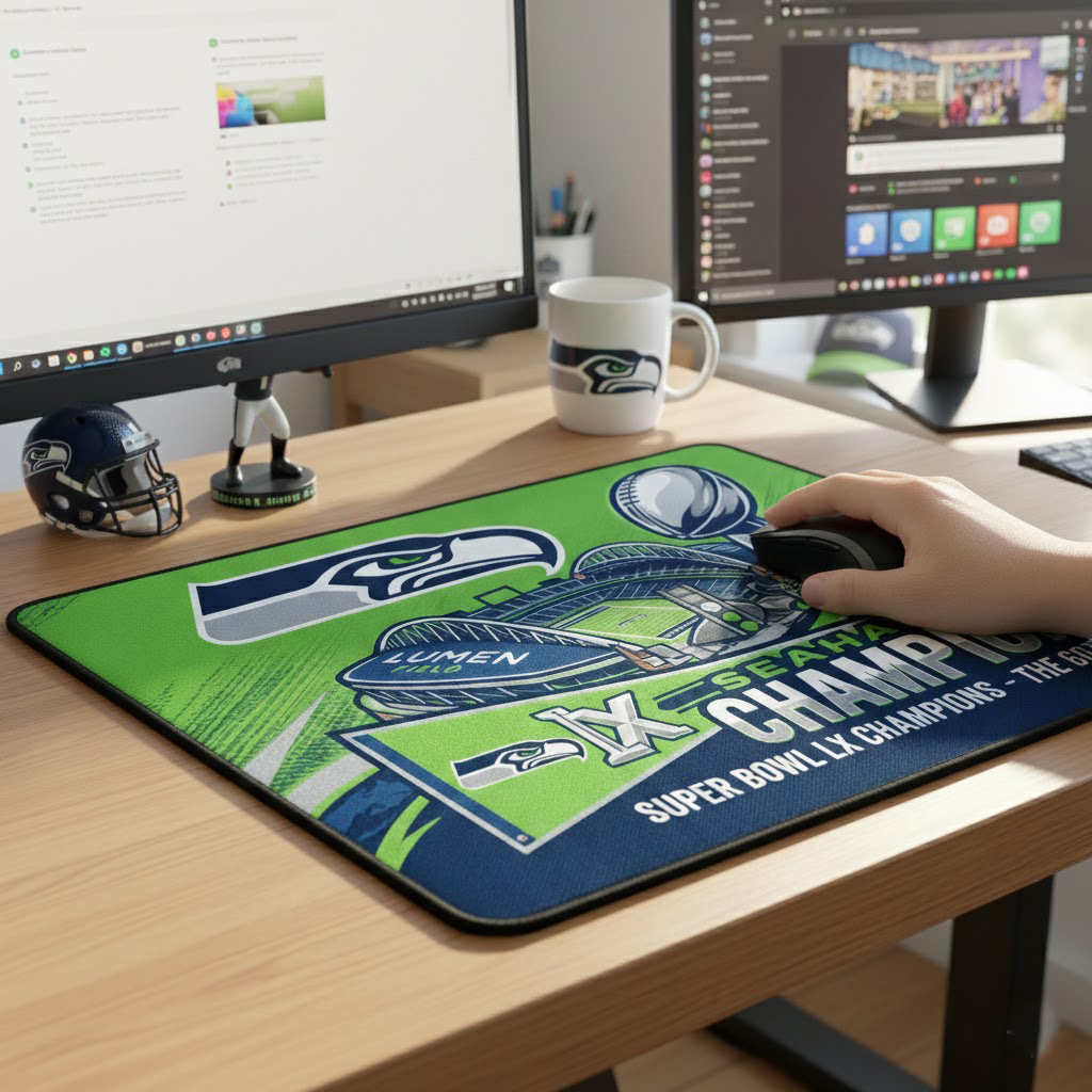 This mouse pad celebrates the unforgettable Super Bowl victory, bringing the spirit of Lumen Field and championship glory straight to your desk.