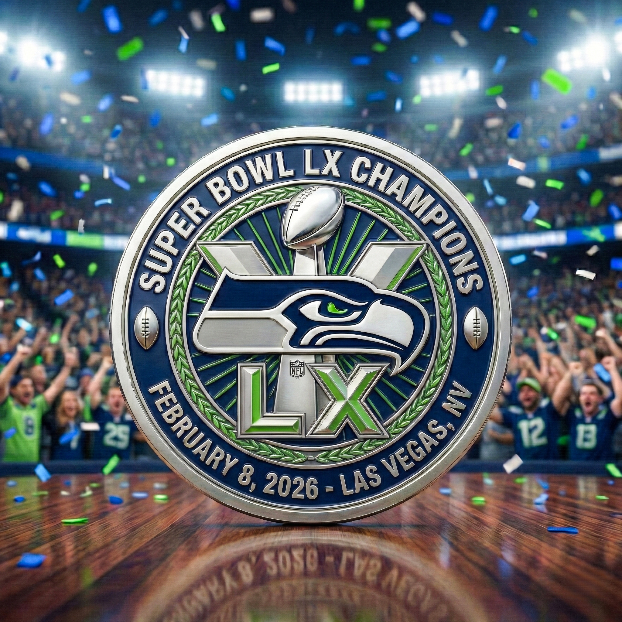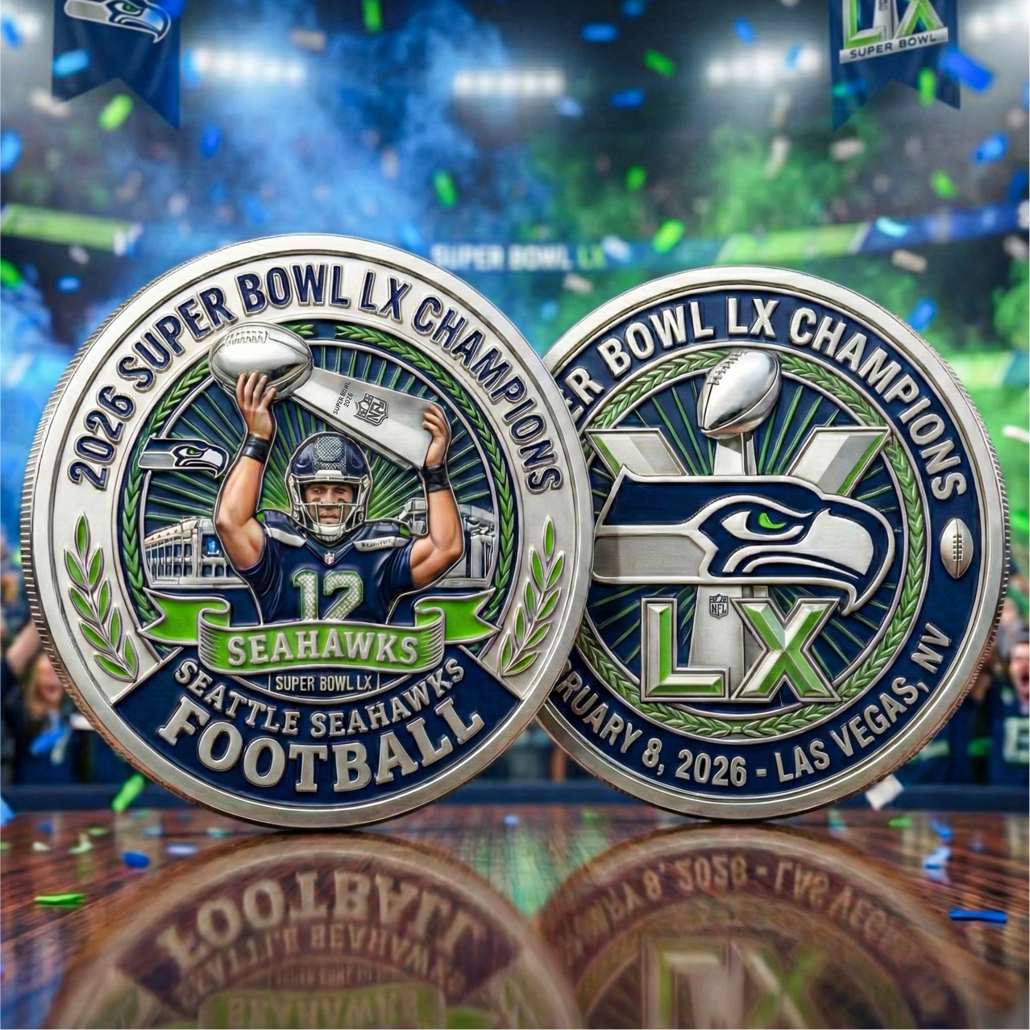 ๐ Super Bowl LX Champions, 2026. Celebrate the Seattle Seahawks’ victory at Super Bowl LX with this limited-edition commemorative coin. Featuring engravings of the Seahawks logo and the Super Bowl trophy, this coin commemorates their championship win on February 8, 2026, in Las Vegas.